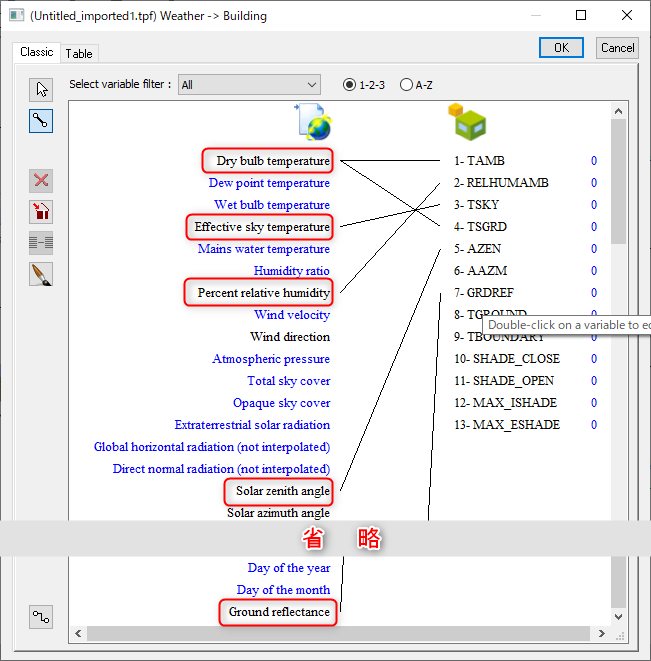 前の状態に合わせてつないで行きますが、TSKY(天空温度), GRDREF(地表面の反射率)の2箇所はつなぐ相手がありません。(矢印の項目)