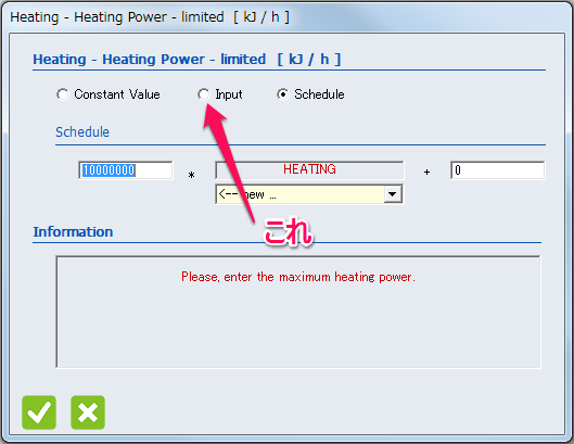 このInputはTRNSYS全般で、コンポーネントをつなぐときに出てくるあのInputです。これを選ぶと外部のコンポーネントから値を受け取ることができます。外部でスケジュールの他、コンポーネントを組み合わせて条件判定によるOn/Offを受け取ることができます。